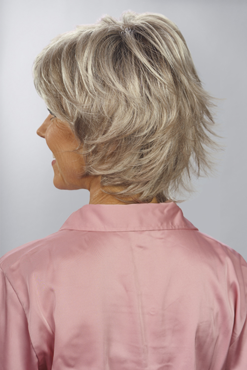 The front hairline has a small taping area to attach double sided medical tape for a secure fit. The fringe measures 3½” , the 5½” textured crown layers give volume where needed, the sides may be flipped behind the ears or swept onto the face giving a very carefree look.